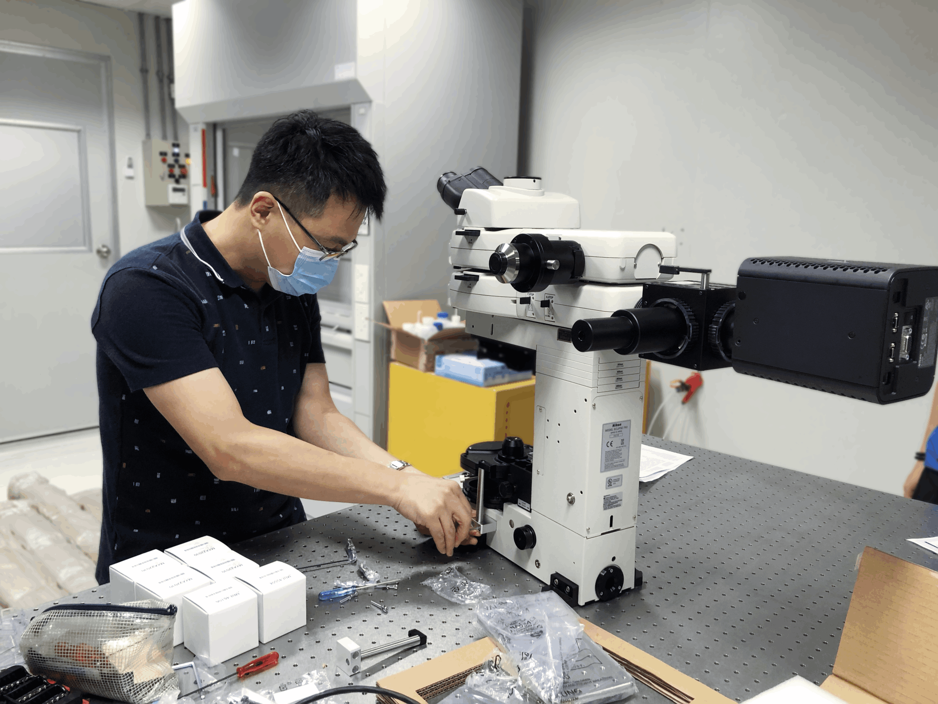The ECLIPSE FN1, developed especially for electrophysiological research, features enhanced operability to facilitate patch-clamp experiments. Advantages offered by the FN1 include slim body, streamlined structure, improved electrode placement, long working distance, and greater noise reduction. A deeper area of the specimen can be observed clearly with infrared (IR) light.