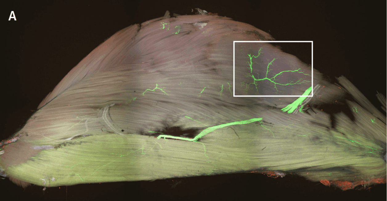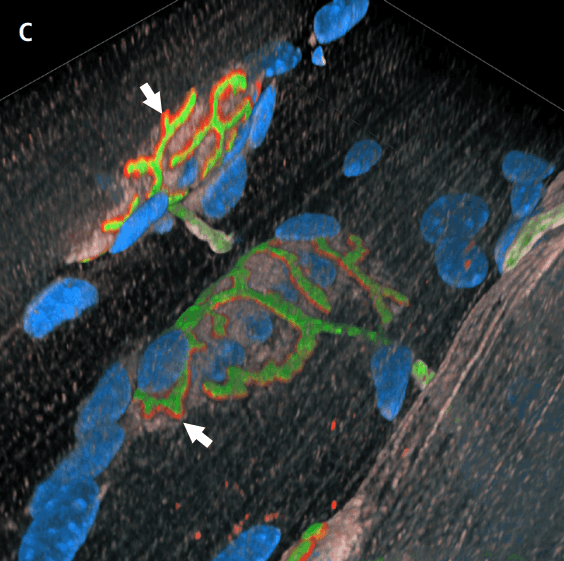 Nerve endings adhering to muscle cells. The white arrows indicate the distribution of acetylcholine receptors (red) surrounding the neurons (green)
