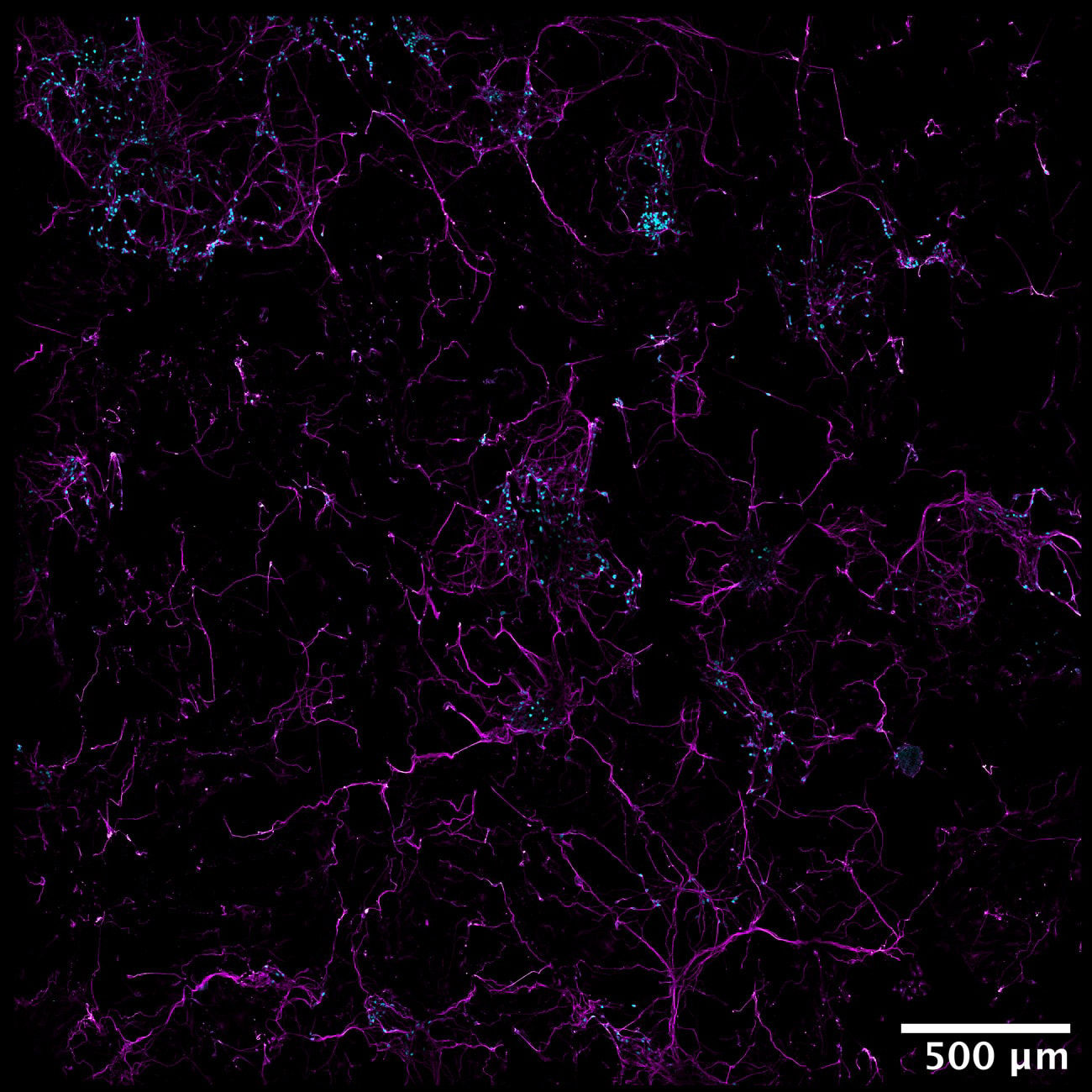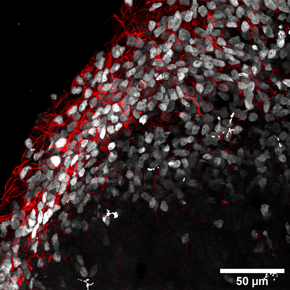 Brain organoid derived from human iPSC line (MAP2-AF488, labels microtubules in neuronal dendrites, TBR1-AF750 labels nuclear